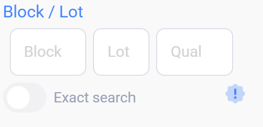 Searching by Block or Lot is the most direct way to find a property, toggling Exact Search will determine if the entered block and lot match exactly or starts with.